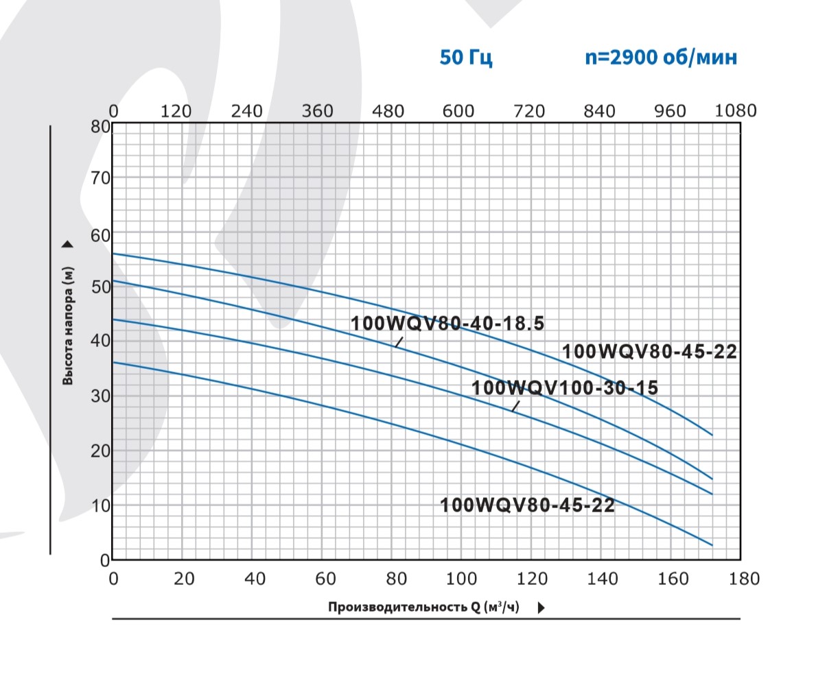 Мощность насоса Purity 100WQV80-45-22/2 составляет 22 кВт, а напряжение - 380В. Насос обеспечивает напор 45 м, производительность 80 м³/ч.