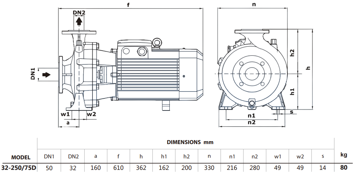 Мощность насоса Purity PSTG-R5 32-250/75D составляет 7.5 кВт, напряженине 380 В. Насос обеспечивает максимальный напор 79 м, максимальную производительность - 20 м³/ч.